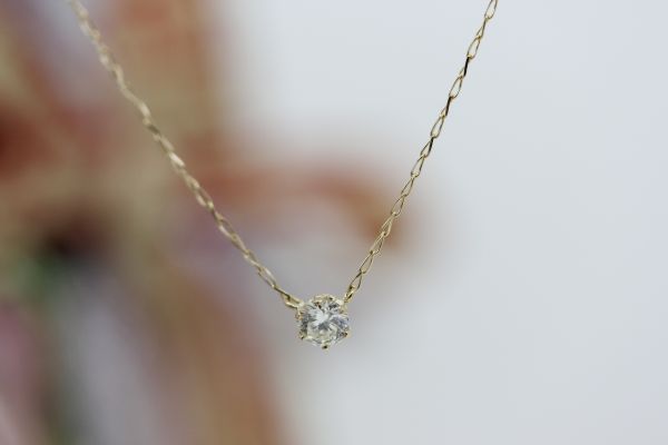 舞鶴市のボンボン堂では、実際に手に取ってその輝きを確かめていただけるよう、様々なカラット数、セッティングのK18YG一粒ダイヤモンドネックレスを取り揃えております。